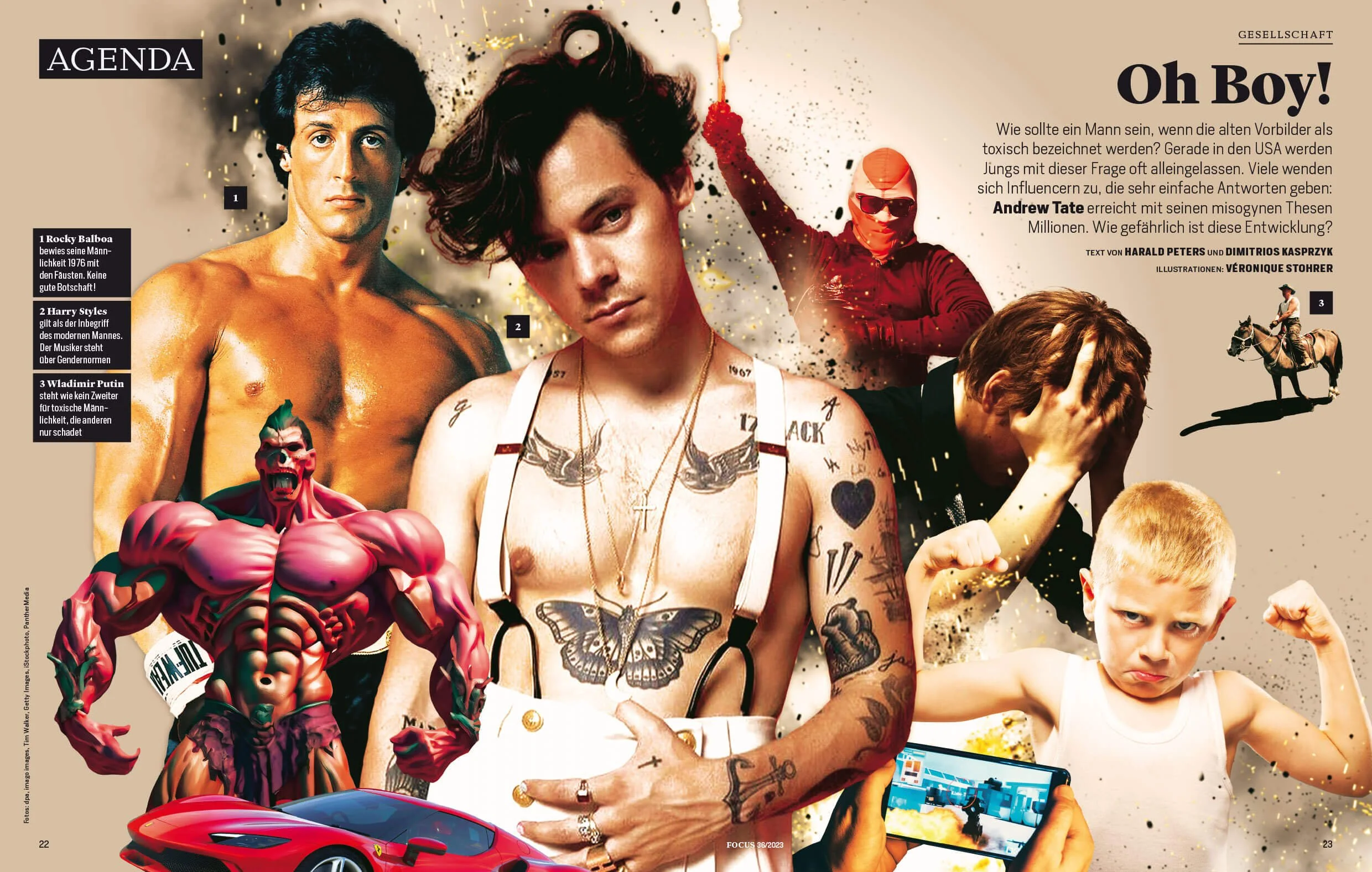 Für den Focus gestaltete ich einen Aufmacher und die Folgeseite zum Thema »Oh Boy!«. Wie sollte ein Mann sein, wenn die alten Vorbilder als toxisch bezeichnet werden? Gerade in den USA werden Jungs mit dieser Frage oft alleingelassen. Viele wenden sich Influencern zu, die sehr einfache Antworten geben: