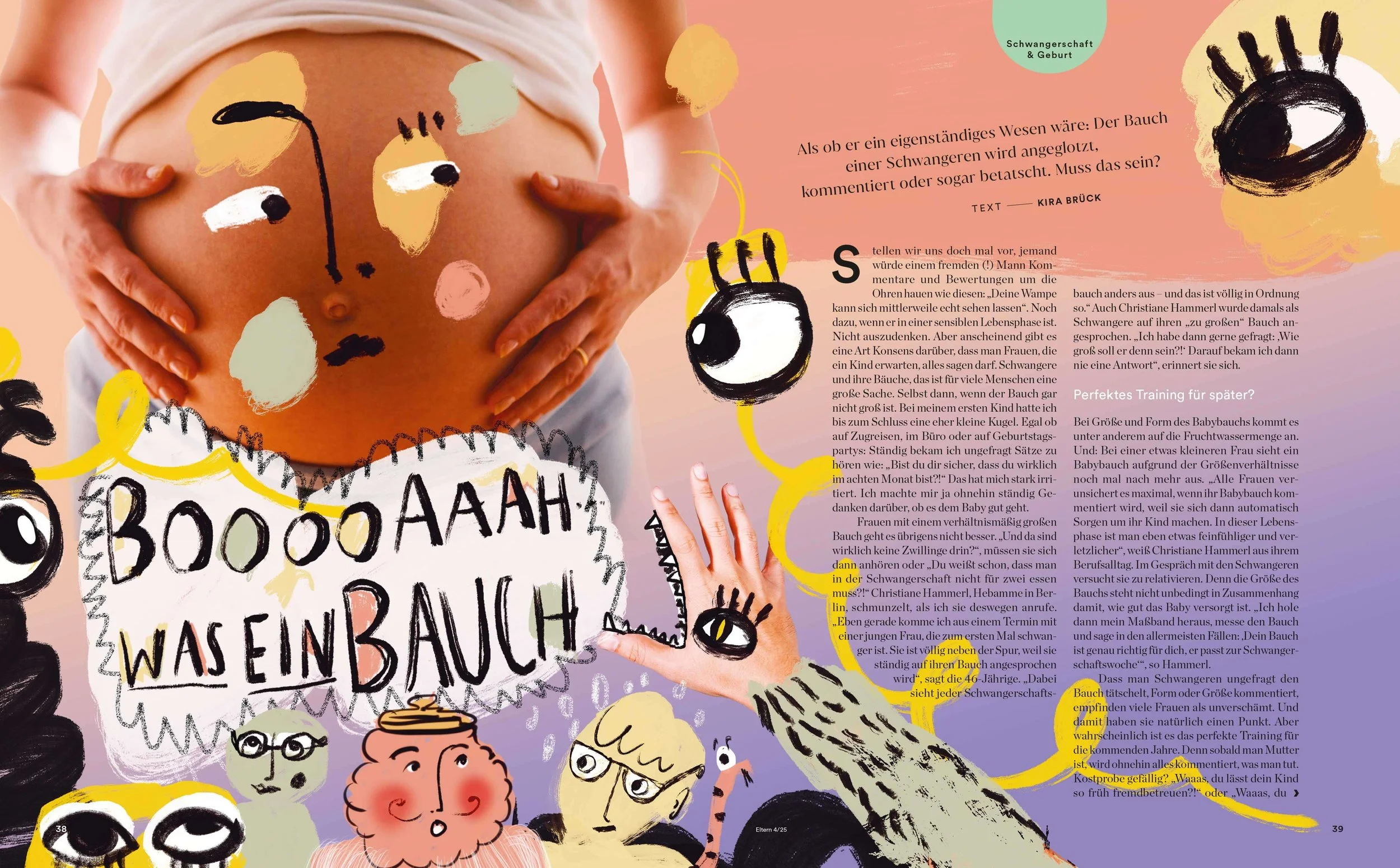 Diese Collagen-Illustrationen für das ELTERN Magazin zeigen mit Humor, Überzeichnung und Sensibilität, wie stark Schwangere öffentlich wahrgenommen, bewertet – und oft ungefragt kommentiert werden. Der Bauch wird zur Projektionsfläche: für Staunen, Angst, Nähe oder Unsicherheit. Die Illustrationen mit dem Titel: „Booooaaah, was ein Bauch!“ brechen mit Konventionen und geben dem Bauch seine Stimme zurück.